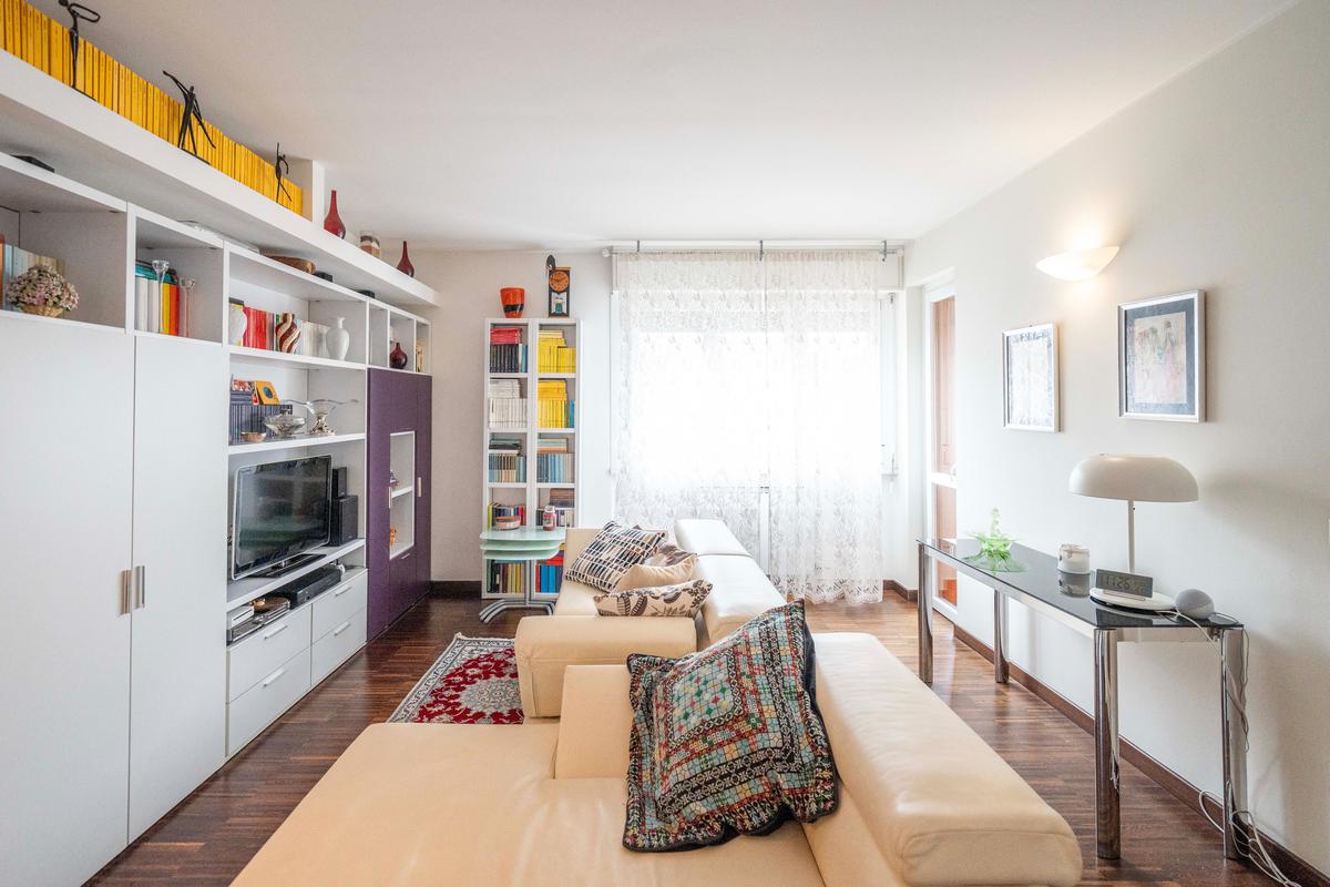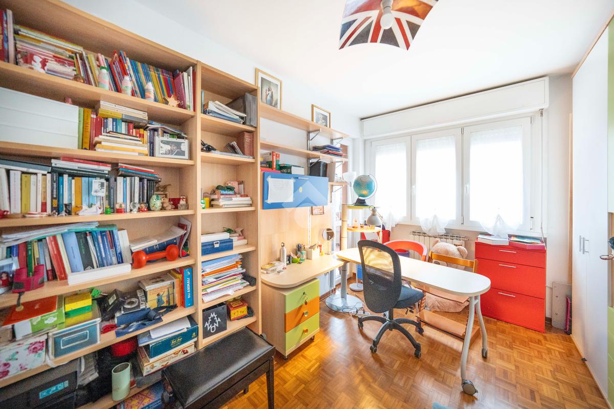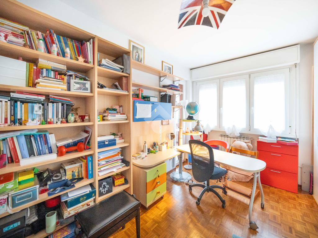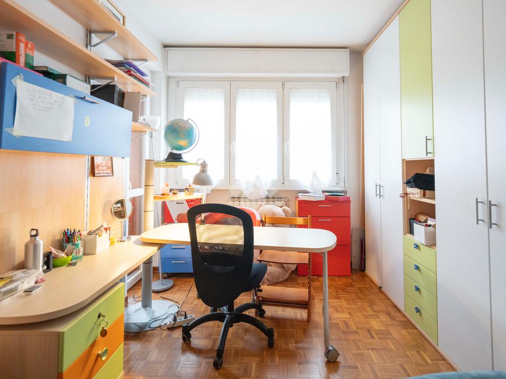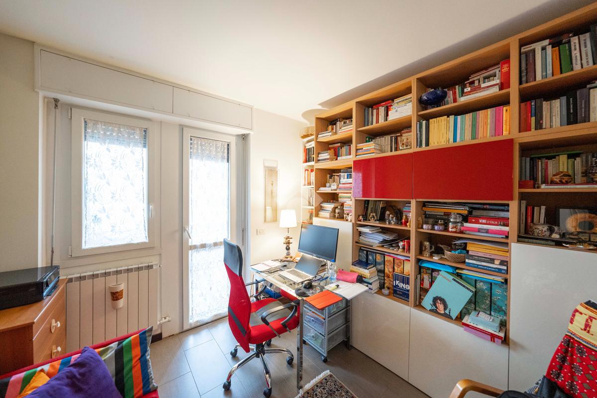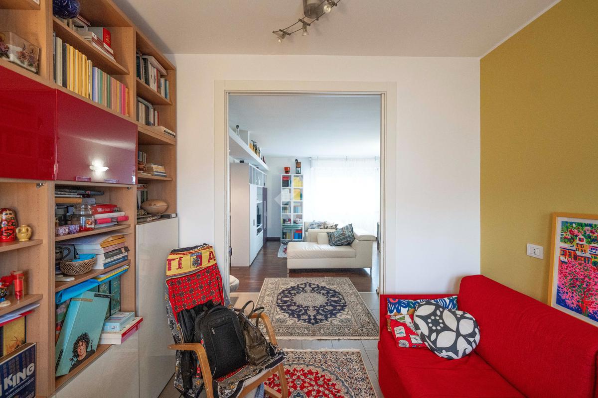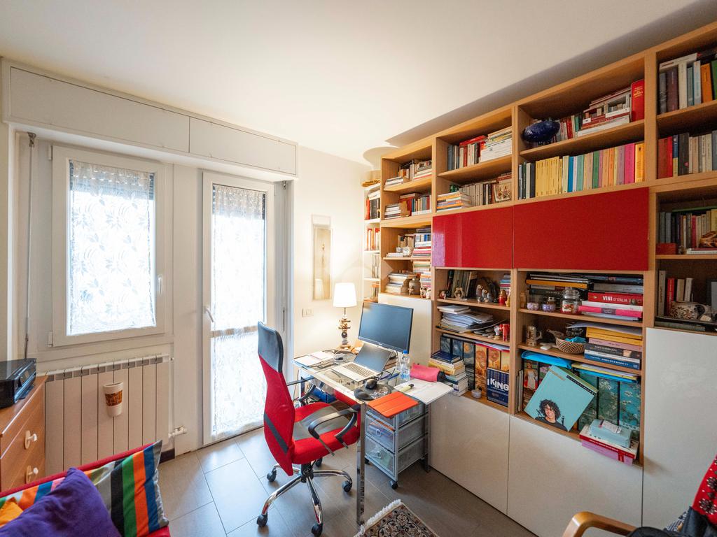 Il soggiorno, ampio e luminoso, si apre su un balcone coperto perfetto per rilassarsi. Adiacente al living si trova lo studio, ricavato dall’originaria cameretta: uno spazio versatile ideale per lo smart working o facilmente ripristinabile come terza camera. La cucina abitabile, separata e funzionale, è collegata agli spazi esterni.