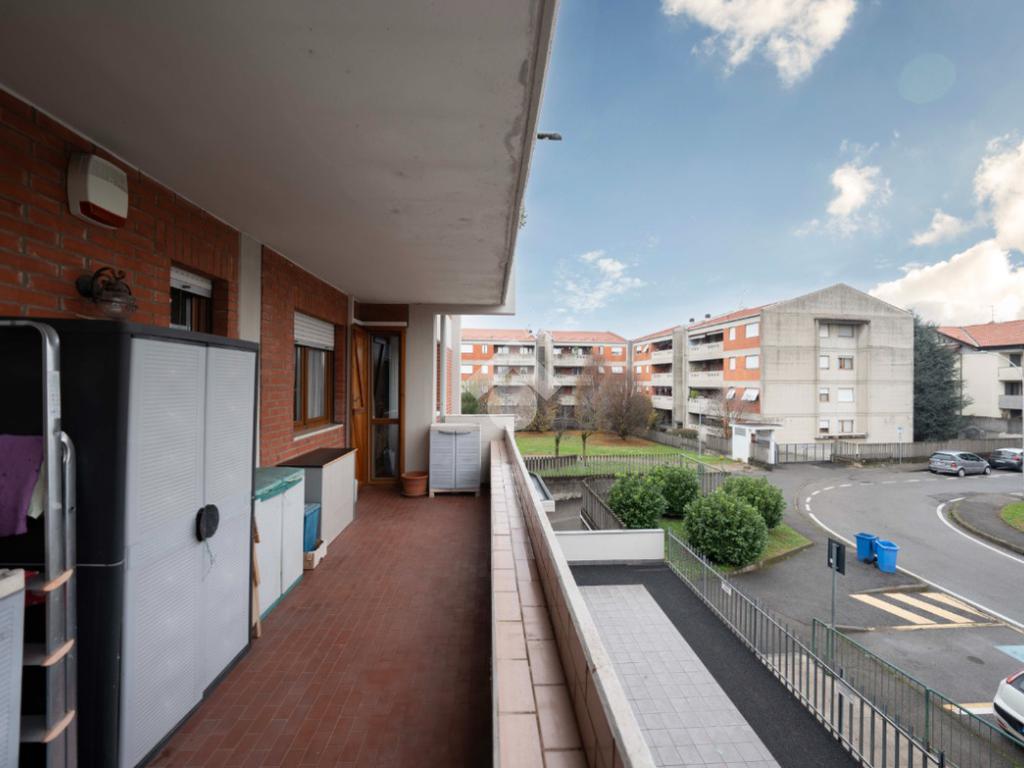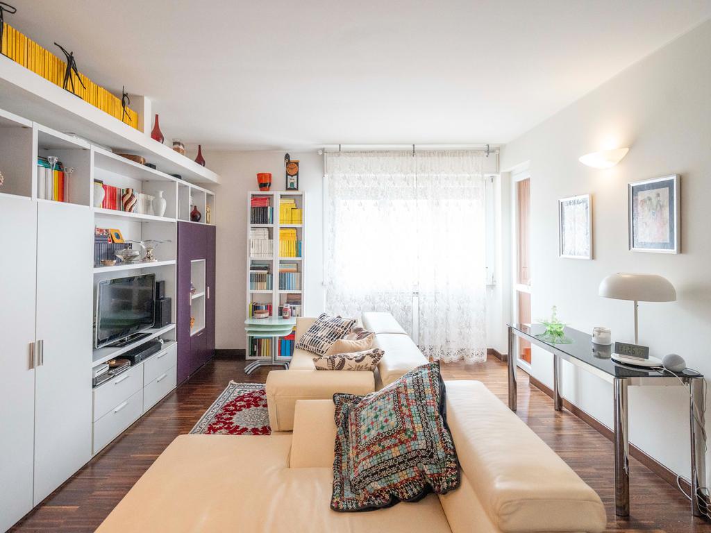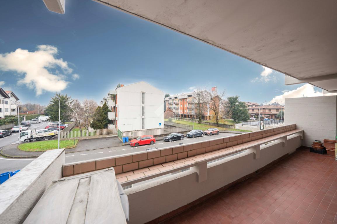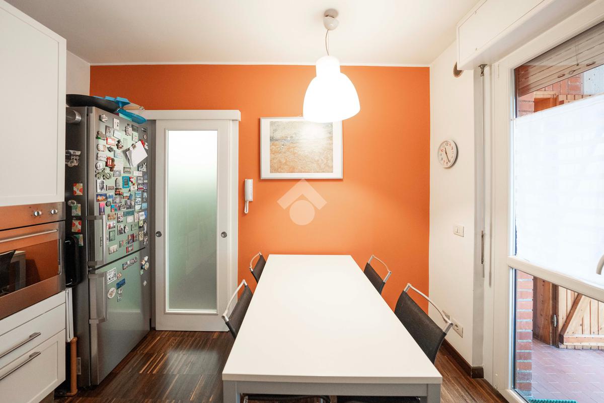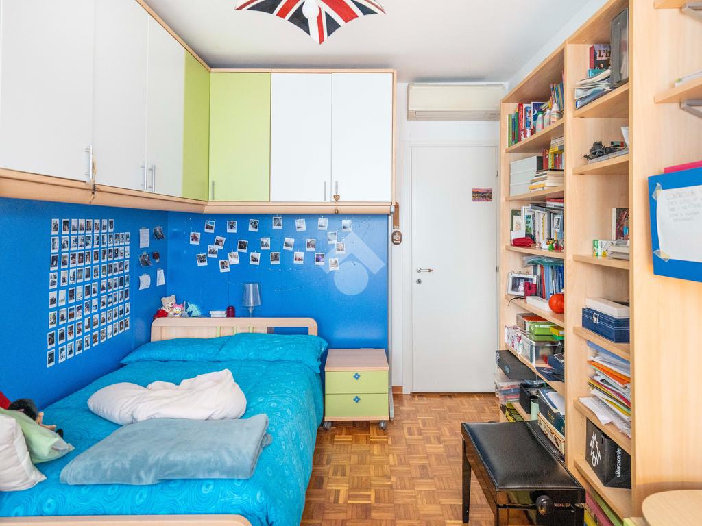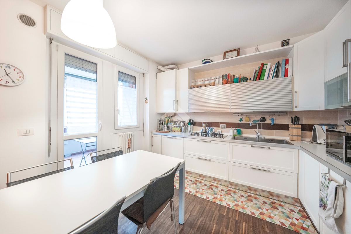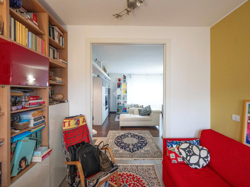 Il soggiorno, ampio e luminoso, si apre su un balcone coperto perfetto per rilassarsi. Adiacente al living si trova lo studio, ricavato dall’originaria cameretta: uno spazio versatile ideale per lo smart working o facilmente ripristinabile come terza camera. La cucina abitabile, separata e funzionale, è collegata agli spazi esterni.
